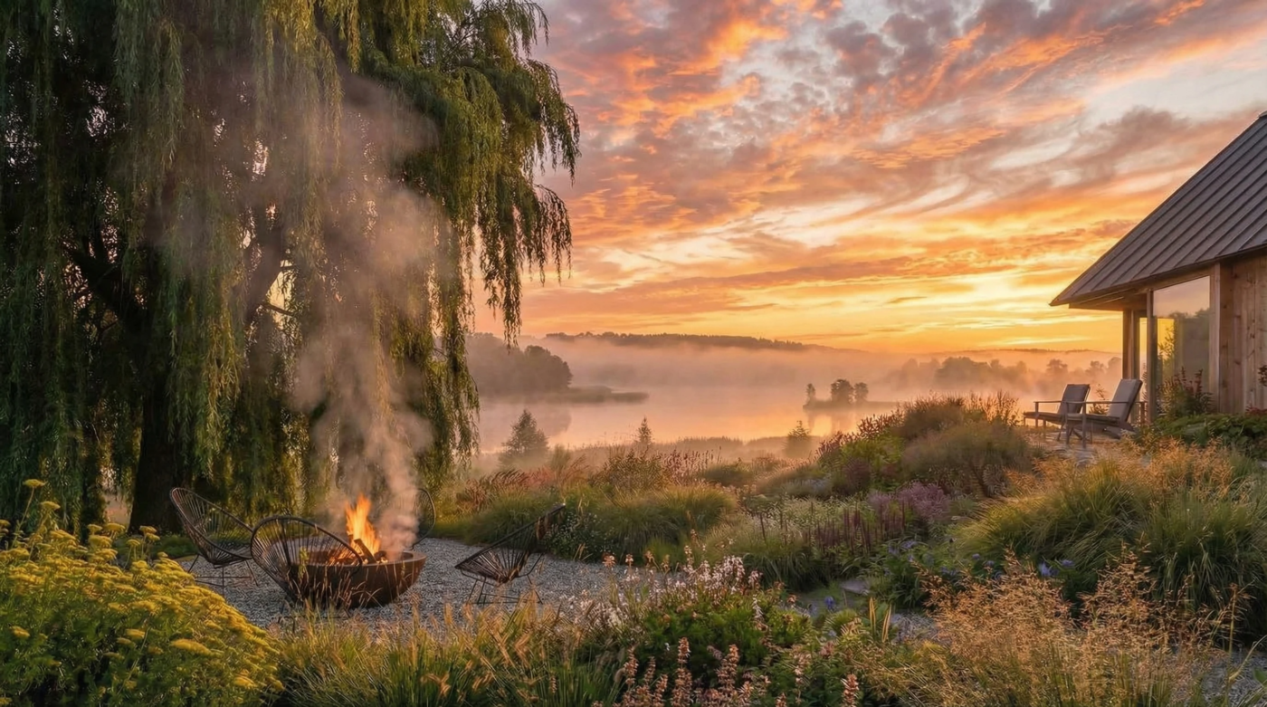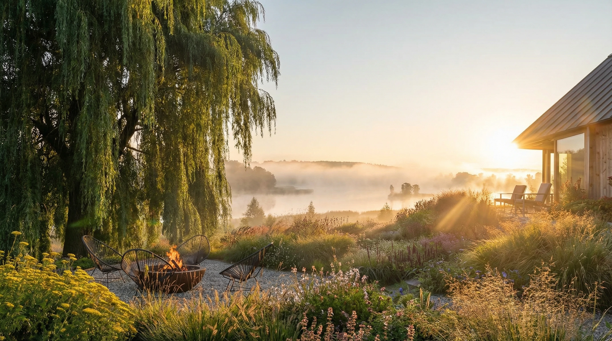Важно было синтезировать мягкую природную среду и архитектуру поселка: вокруг слишком много домов, чтобы не брать их во внимание. Решили идти через сочетание растительных фактур: мягкость, транспарентность (злаки, цветущие многолетники, ива) и плотность, четкость (блоки изгороди из туи). Сердце ландшафта — очаг. Растительная доминанта — плакучая ива: она дает необходимый объем и движение, легкость. По требованию — газон и огород.